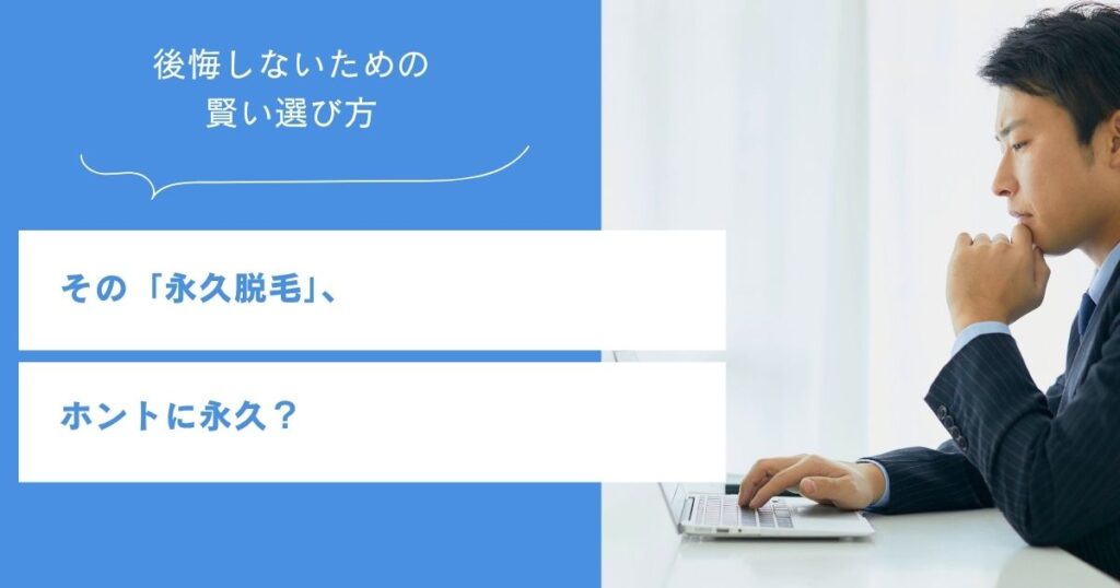 「ヒゲ脱毛をすれば、もう一生ヒゲ剃りしなくていいの?」「よく聞く医療脱毛とエステ脱毛って、何が違うんだろう?」ヒゲ脱毛を考え始めると、そんな疑問が浮かんできますよね。特に「永久脱毛」という言葉には、大きな期待と少しの不安が入り混じるもの... -